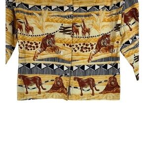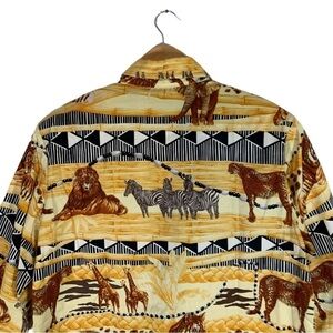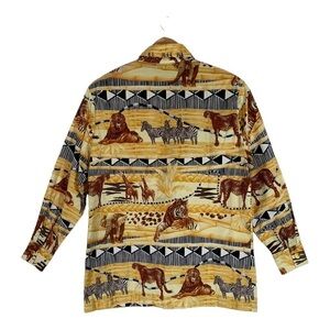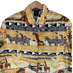 Features: This is a like new with no signs of wear classic vintage Escada safari shirt. Collared. long sleeves. button cuff detailing. Hidden button closure. All over Safari print. Removable light shoulder pads.100% cotton.