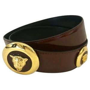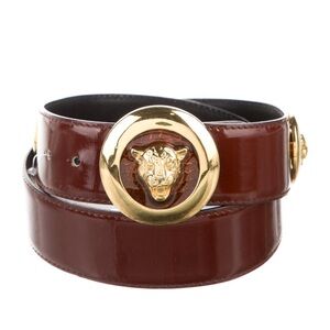 Vintage Escada Tiger Head Belt Brown Patent Leather Gold Medallion. EU size 38 (XS). Peg-In-Hole Closure. Gold tone hardware. Excellent condition.