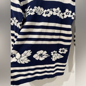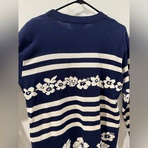 Navy blue and white Breton stripes with a tropical floral Hawaiian hibiscus pattern. Nautical, coastal, travel, vacation, coastal grandma. 100% cotton. Longline, knit. Shoulder pads, long sleeves, vintage. Almost like a lightweight knit blouse/sweater. Nantucket style