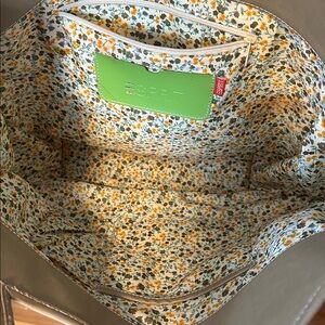 Floral fabric lining with three inner compartments - two open and one zipper closure.