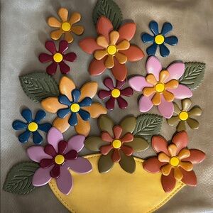 A fun and unique vintage piece with no signs of outer wear. Bold and beautiful 3D floral appliqué against olive drab green/beige background.❗️Flaws pictured - what appear to be two pen marks and staining on inside liner.