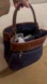 Chic Esprit tote with a dark blue body and chestnut trim. Front zipper pocket for convenience. Durable handles for easy carrying.7.5” wide s d high, 4.25” deep. GenX ladies relive your teens with this cutie !