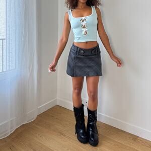 Grey check with wide belt tabs and chunky buttons at the waist. Smooth, non-stretch woven with a side zipper closure; low-to-mid rise and a clean A-line mini.