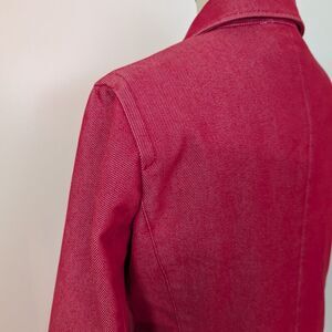 Classic 1990s/Y2K vintage Esprit mid-length coat in red denim. Coat is in excellent condition for its age showing little signs of wear other than typical wear along hems, etc. One very small spot of discoloration on sleeve (about 1/8"). Single breasted, unbelted trench with hidden buttons, fully lined interior, and deep felded side pockets. Made with a heavy cotton/poly denim twill. Tailoring details include princess seams, two-pieced sleeve, and a kick pleat on back.