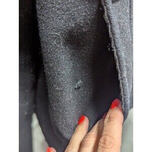 Pre-owned in.good conditin. One pocket is missing button to close. Wool Blend is very clingy and coat hasn't been cleaned or lint rolled