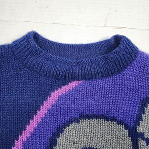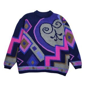 Stylish sweater with bold geometric patterns. Features vibrant pink and blue tones. Perfect for a chic look.
