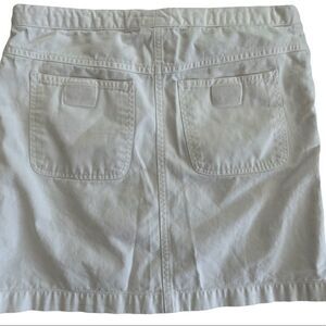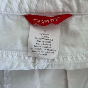 Vintage Esprit white drawstring waist 100% cotton skirt, size 0. Tie front, two front slash pockets, two back pockets with Velcro closure. Faux fly. Approximate measurements are waist flat 15”, length from waist approximately 15.5”.