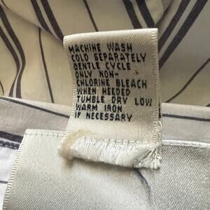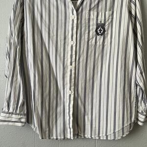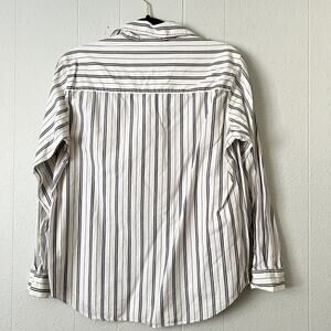 Vintage Essentials women's striped shirt. Collared. V-neck. Button down. Long sleeves. Buttoned cuffs. Embroidered logo. Stretch, natural & breathable fabric. In good used condition. No stains, tears or holes.