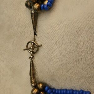 Elegant blue beaded necklace with silver accents, perfect for any occasion.