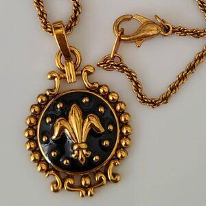The Vintage Estate Fleur- De- Li Necklace Pendant features a non-magnetic chain with a length of 16 inches. This pendant-style necklace is made of enamel and metal, with a vintage design that exudes a unique charm. Lobster closure.Perfect for those who appreciate vintage and antique jewelry, this necklace is a timeless addition to any collection. Excellent vintage condition.