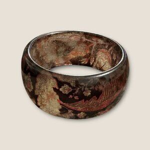 This vintage bangle bracelet features a captivating floral design encased in resin. Its classic style adds an elegant touch to any outfit, making it a versatile accessory for everyday wear or special occasions. The durable resin material ensures long-lasting wear while maintaining the intricate floral detailing.