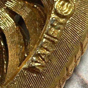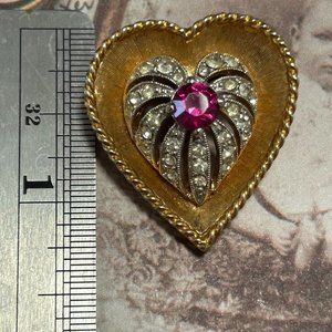 Vintage Estate Signed Napier Gold Heart Ruby Red Rhinestone Pin Brooch True vintage designer signed brushed textured gold tone heart brooch pin with working locking pin mechanism and a ruby red colored rhinestone accented with clear rhinestones. Shown with a ruler to demonstrate size. Shows minor evidence of age and use. Vintage costume, signed, jewelry, brooch, pin, Valentine's Day, love, symbol, theme, retro. The ruby red colored rhinestone is a costume stone that is red with hints of pink in it.
