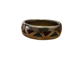 Vintage Estate Wide Band Mexican Silver Ring with Inlay Turquoise Stones Size 9