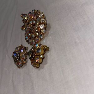 Vintage Estate Unsigned Brooch And Earrings Set Aurora Borealis And Rhinestones