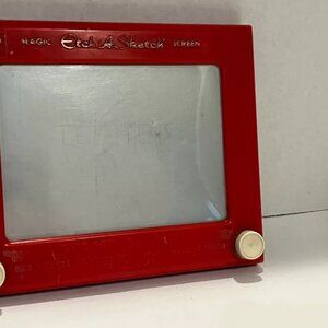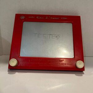 Preowned but tested and works. Dials work. Vintage etch a sketch screen. #505 Ohio Art Classic Toy. Heavy use on screen, but still can see the drawings. Red base color. Black backing.