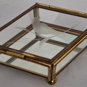 Vintage Etched Bird Glass Diamond Shaped Jewelry Trinket Box