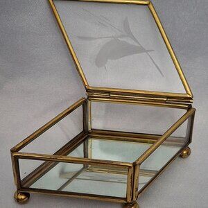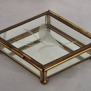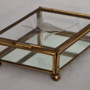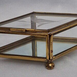 Vintage Etched Bird Glass Diamond Shaped Jewelry Trinket Box is 4 1/4" long x 2 3/4" wide x 1 1/2" tall. This beautiful box has a glass top etched with a bird on a branch, glass side panels with a mirrored bottom all framed in brass. It has 4 ball feet and a bar handle to lift open the top. Made in Mexico. No chips, cracks or repairs. Please view the pictures and feel free to ask questions. Thank you for visiting my shop.