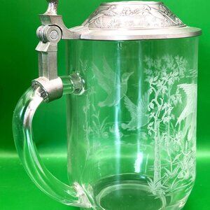 Vintage Etched Glass Beer Stein Tankard Lid Duck Goose Pond Scene Germany France