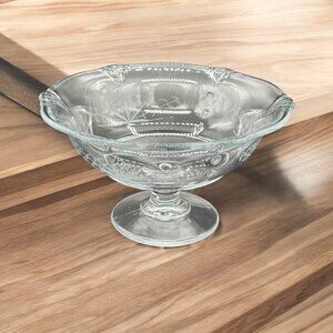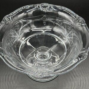 This vintage glass pedestal bowl features an elegant etched floral pattern. Ideal as an accent piece or for presenting treats with timeless charm.