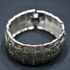 *Description: This is a beautiful vintage etched floral bracelet in a mural design from the 1970s. This bracelet design was made by several companies including Sarah Coventry and also stamped West Germany. This particular bracelet is unsigned. It has a mesh backing and a very light reflective silver tone finish. It has a mesh backing which each mural link is attached to. The floral pattern is designed across the links in a mural pattern. This would be a great addition to your vintage jewelry collection or make a great vintage gift!