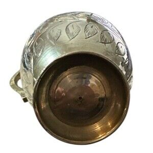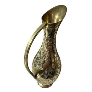 Vintage Etched Solid Brass Pitcher India Etched Floral Design MCM 6 in Tall