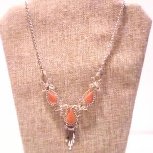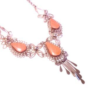 This stunning vintage necklace showcases the artistry of Peruvian craftsmanship. Fashioned in a silver finish, it features exquisite orange jasper stones nestled among intricate wirework designs, creating a striking and unique statement piece.