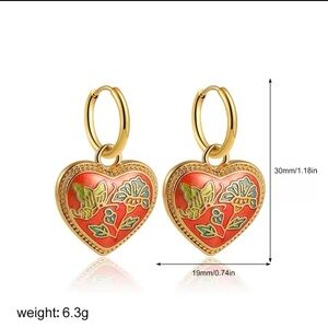 Vintage Ethnic Red Enamel 18K Gold Stainless Steel Gold Heart Earrings