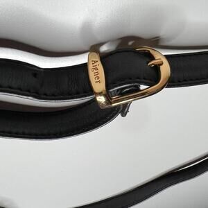 Authentic vintage Etienne Aigner women’s shoulder bag in smooth black genuine leather. Features a gold-tone signature “A” logo on the front and matching buckle with “Aigner” engraving. Zip-top closure opens to a spacious interior with zip and slip pockets, lined in black fabric with “Etienne Aigner Genuine Leather” embossed tag. Adjustable strap for comfortable wear. Classic and versatile piece with minimal wear—see photos for details.