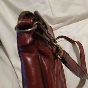 Just beautiful classic Etienne Aigner vintage 1970s oxblood red( Burgundy) leather. Quality craftsmanship as expected from an Aigner handbag. Handmade shoulder bag with detachable strap. Roomy interior lined in black fabric with a side interior pocket. metal band tension closure. Brass hardware with enameled Etienne Aigner oval logo.