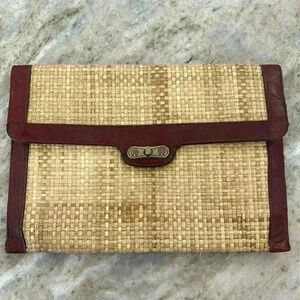 Straw Clutch Envelope Bag with Burgundy Oxford Leather Trim