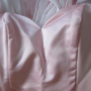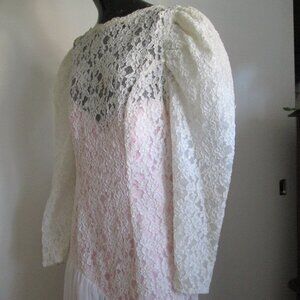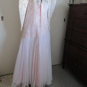 Vintage Eugene Alexander white exquisite lace beaded bodice with full chiffon skirt - pink satin lining back half open back - puff shoulders with snap cuffs. Exquisite embroidered lace mesh with beading accents. Pictures does not beauty of this elegant gown. Stunning gown worn only once.