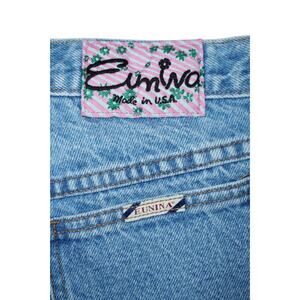 Serve major 90s/Y2K energy in these authentic vintage Eunina high-rise denim shorts. Made in the USA from 100% preshrunk cotton, these light wash cutoffs feature a flattering high waist, back patch branding, and signature Eunina tab. The pink and green floral label adds a playful touch, perfect for your summer fits.