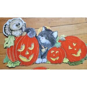 Vintage Eureka Halloween Die Cut Double Sided Flocked Pumpkins Kitten Owl Lot 2