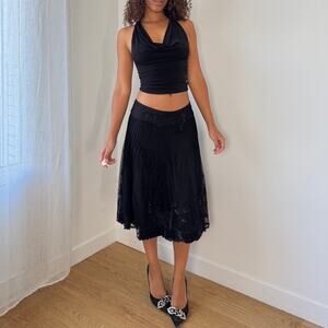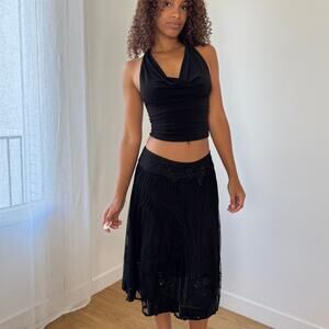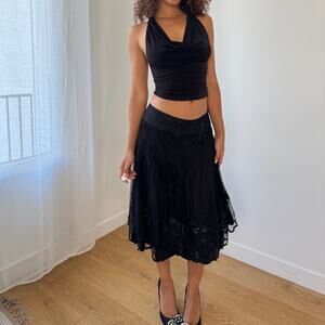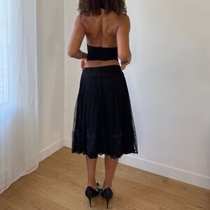 Black silk–nylon mesh midi skirt with tonal embroidery and scattered sequin detailing, a wide yoke waistband and softly pleated body; sheer embroidered hem and zipper closure.