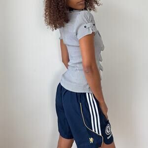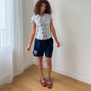 Black-and-white micro-pinstripe blouse with a sculpting fit, cascading ruffle placket, flap chest pockets and contrast buttons; slight stretch for comfort. Hand sourced in Europe. Free shipping on bundles <3