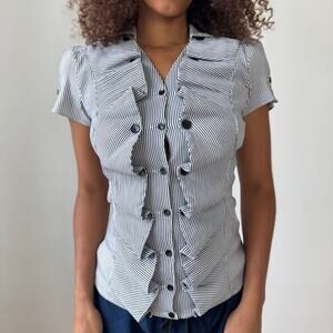 Vintage Euro Black & White Pinstripe Ruffle Button-Down Blouse with Stretch (S)