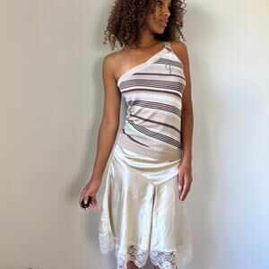 Cream, taupe, and chocolate striped one-shoulder knit tank with metal ring hardware at the strap and subtle rhinestone monogram detail; soft stretch and an easy pullover fit. Hand sourced in Europe.