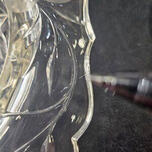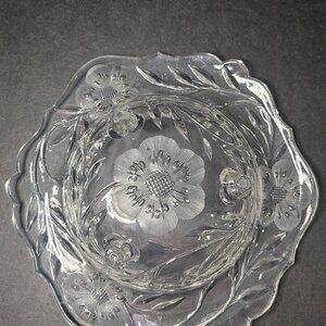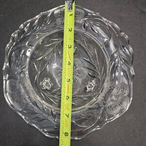 Large vintage European stunning cut crystal round footed bowl with a spring floral design and a wide pedal rim. The 3 glass feet appear as three little flowers when looking down into the bowl. The crystal glass on this piece is quite thick. It measures 5/16 inches thick. Flowers on this bowl are etched, a rib pattern, leaves and vines are deeply cut. There's one small fine scratch on top near edge almost appears part of vine. A small dot or nick on underside on the frosted pedal of the flower. See my photos of this minor flaw. Price accordingly with tiny flaws into consideration. Dimensions 8 inch in diameter has 2 inch rim, 2 inches high 4 3/4 inches deep. Non in smoking pet free home.