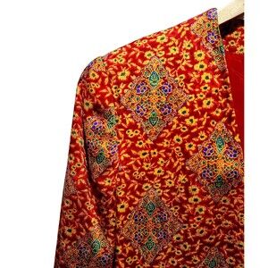 This is a beautiful, eye-catching, colorful blazer with rich shades of golden yellow, deep forest green, royal blue, against a deep red background. This blazer has 2 front pockets & is fully lined, yet still lightweight. Single button closure with matching accent buttons on the sleeve cuffs. This blazer would pair nicely with a pair of jeans, dress slacks, or a skirt. Rare pattern, vintage blazer.