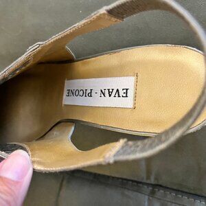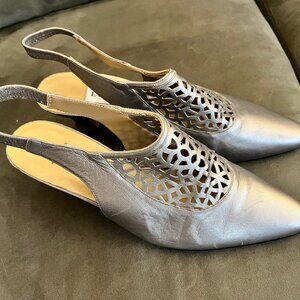 The color is a dark Silver/Gray muted metallic. Stretchy sling back, 2/5 inch heels. Ornate lattice cut-out and closed toe.