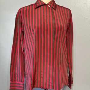 Vintage Evan-Picone Striped Long Sleeve Blouse. Size 6. Approximate measurements laying flat are 19” pit to pit, 22 1/2” sleeve, and 25 1/2” length. It fits oversized for a 6 because I wear Large and I can close it but it gaps a little in the bust area. The colors are a pink raspberry and dark green. Very unique colors and style. 100% polyester. In excellent preowned condition with no noted flaws.