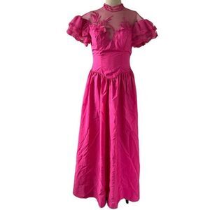 Vintage Eve of Milady Hot Pink Floral Ruffle Sleeve Maxi Prom Formal Dress Sz S