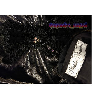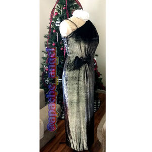 French Material Velvet/Metallic Gold Lame Fabric Hand Made Evening Gala Dress One of a kind by Natalie Aronson (handsewn tag) it features a beaded "bow" w/AB Rhinestones, ruched on the right side, there is a slit on the bottom left side of the dress, padded shoulder and spaghetti strap, Hidden zip side. The material is very comfortable to wear, silk lined. 1960's Cocktail
