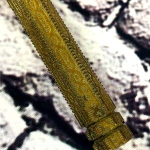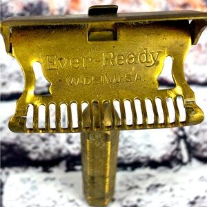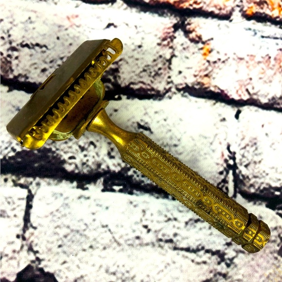 Made of nickel/chrome brass plated, chain link design. It has a nice greenish patina. The handle is removable and the top flips open and it uses a standard single edge blade.