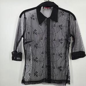 This Vintage Evolution blouse is a unique find! It features a sheer mesh style with beaded accents, perfect for a rave, whimsy goth, or Y2K look. The blouse is in good used condition and comes in size S.