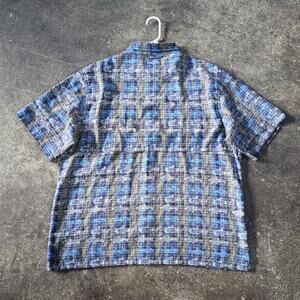 This men's size XL shirt features a stylish blue and tan fish plaid pattern.