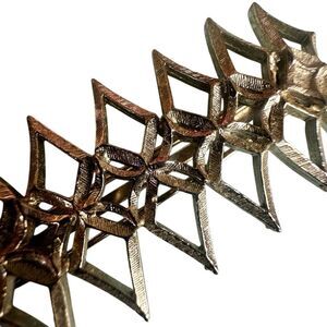 Unusual mid-century hair accessory with an expandable diamond-lattice silver-tone top and dual wire prongs. The barrette stretches to hold more or less hair, making it versatile for updos, half-ups, or ponytail styles. Solid metal construction, sturdy and eye-catching with a bold geometric design.
