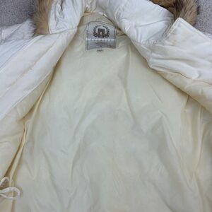 Express vintage badger fur trim coat in ivory, womens size small. Hooded, pockets and drawstrings inside at the waist and at the bottom for a more fitted style. Real badger fur trim on the hood. Zips up with overlap and buttons closure, beautiful buttons and comes with a spare button. Embroidered at the shoulders, down the middle and on the pockets. The shell is made of rayon and polyester, lining is nylon, and the fill is the Glacier Shield feather touch insulation made from polyester. Such a beautiful and unique piece!