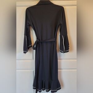 This elegant black wrap dress features a stylish white trim at the sleeves and bottom hem. Its sophisticated design and comfortable fit make it a must-have in your wardrobe.