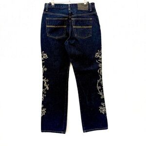 Vintage Express bootcut jeans featuring glitter details on the legs. These jeans are potentially from the 90s and have a dark blue denim wash with intricate floral or baroque-style glitter. Please note that there are flaws shown in the pictures.